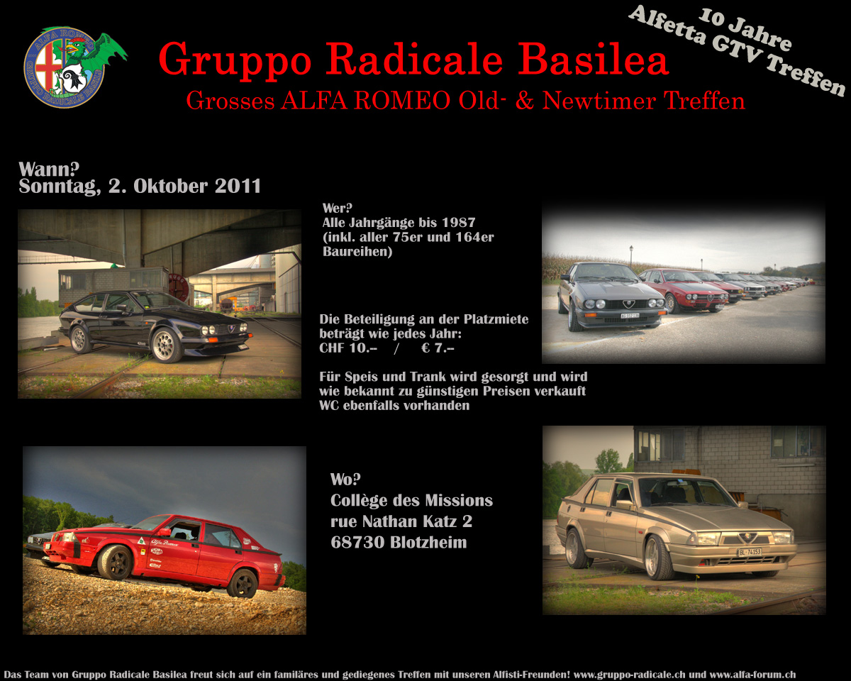 Wie immer ist es ein Alfa-oldschool Treffen, an welchem aber auch neue Alfas herzlich willkommen sein werden. Wie werden eine andere Ausfahrt machen als letztes Jahr, es werden Pokale verteilt und natürlich wird auch für das leibliche Wohl gesorgt sein.
