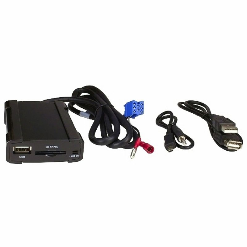 USB (SD/SDHC und AUX) Adapter zum Anschluss von USB-Sticks, USB-Festplatten, iPod, MP3-Player, Mini-Disc, CD-Spieler an das OEM-Autoradio. Dank integriertem Kartenslot ist auch die Verwendung von SD/SDHC Speicherkarten möglich.
