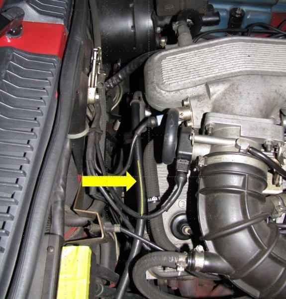 b) er den Schlauch (siehe Bild) mit der Zange zudrückt, von dem er glaubt, dass es der Benzinschlauch ist. Das ist doch ein Druckschlauch oder?