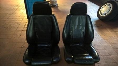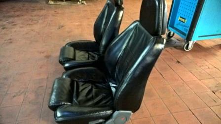Beide vordere Sitze, wurden früher mal mit schwarzem Leder bezogen. Sitze ohne Konsolen (Untergestell, muss von bestehenden Sitzen umgebaut werden). Sitze an sich in gutem Zustand, wurden von einem Vorbesitzer aber mal falsch behandelt, wodurch sie einen "speckigen Glanz" erhalten haben. Hier müsste man also mal mit der richtigen Lederpolitur dahiner.