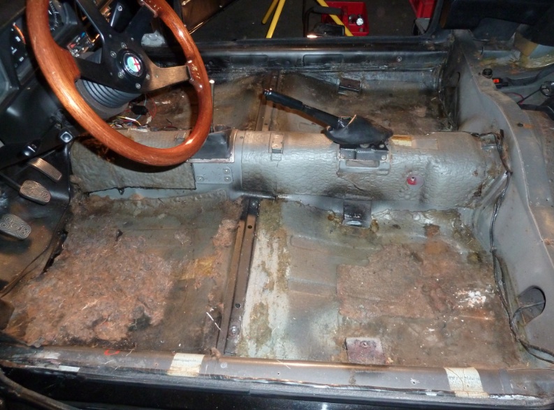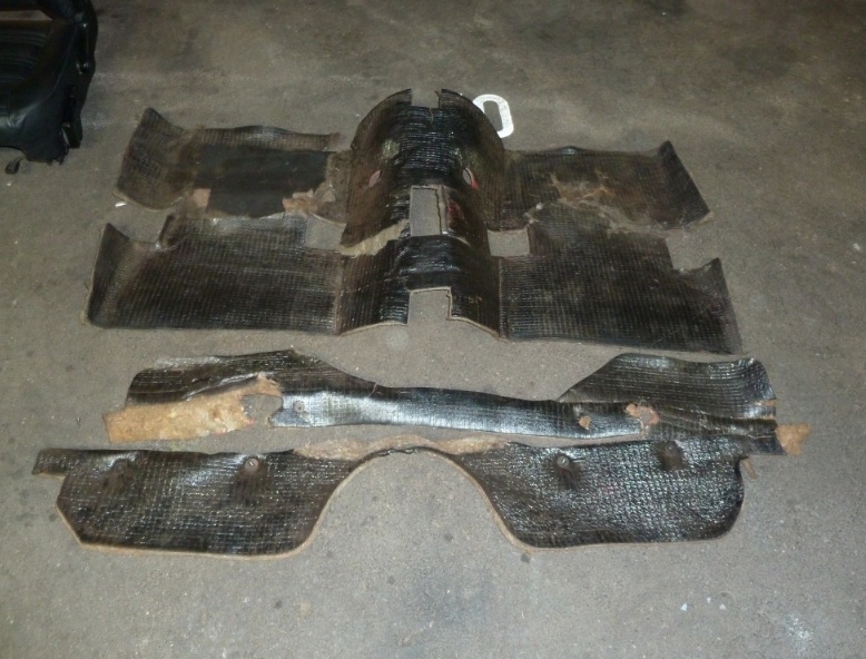 Nachdem das ganze Interieur und der Bodenteppich raus war, konnte ich es doch nicht lassen noch einen Kontrollblick unter die Dämmmatten zu werfen. Leider kam nur noch der obere beschichtete Teil der Matten mit, die untere Hälfte klebte so stark am Boden (siehe Fotos) dass ich die Dämmmattenreste mit einer Stahlbürste "rausbürsten" musste.