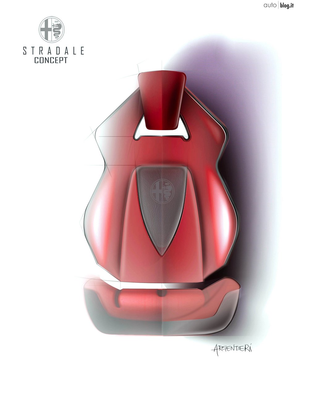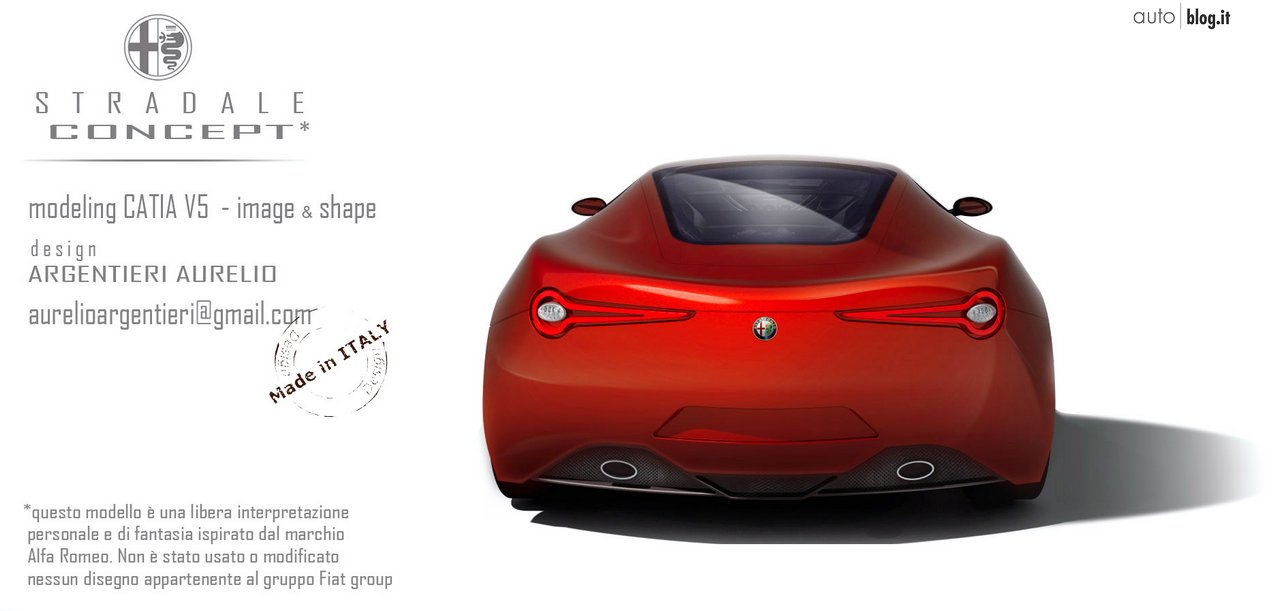 “Ho voluto interpretare una possibile sostituta della 8C basandomi sugli elementi essenziali che contraddistinguono un’ Alfa Romeo, da sempre simbolo di sportività, ma senza elementi estremamente futuristici… così ho pensato ad una vettura con motore posteriore e con le dimensioni da sportiva pura. Lunghezza: 4440cm - Larghezza: 1930 cm - Altezza: 1250, una vettura dal carattere estremamente sportivo ma che si può guidare tutti i giorni nelle strade cittadine; da qui il nome “Stradale”, che riprende sia il concetto che il nome della mitica Alfa 33 stradale dei fine anni 60. Ho lavorato più sulla forma ed il volume della vettura, lasciando delle vaste superfici estese non interrotte da prese d’aria o inserti cromati. Anche lo scudo anteriore è privo della classica cornice e bacchette orizzontali cromate. Stessa cosa per il posteriore, che si ispira per i fanali alla Giulietta, ovviamente in una forma evoluta eliminando la classica forma circolare adottata sulla 8c ma che si ritrova anche sulle Ferrari. A questa vettura ho voluto dare uno stile razionale, con volumi puliti e linee semplici. Per la modellazione della vettura ho usato il software Catia V5 e nello specifico il modulo “Imagine and Shape””