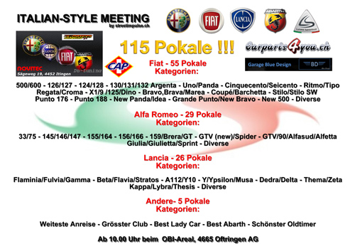 Also wie schon mehreren gelsen gaben findet an 27.sept.09 ab 10.00 -17.00 ca.Eintritt kosten 20.-fr.entlich ein Italo Treffen mit GENUG pokalen :D wir haben lange darüber geredet wie es am besten kommen soll,wir haben sogar von 90 Pokale au 115 pokale nach gerüstet.Wir von streetimpulse.ch freuen uns diesen meeting zu Organisieren so das einmal wieder alle schöne italienische autos zu sehen kommen.