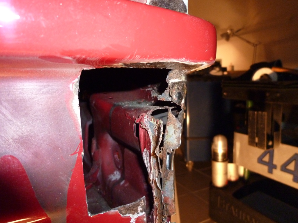 Als Erstes hab ich mich der hinteren, rechten Ecke angenommen: Sah ja auf den ersten Blick nicht so schlimm aus, aber: An dieser Stelle kommen drei Bleche zusammen - der Rost sass tief im Falz. Also alles rausgeschnitten: Die drei Schweisspunkte ausgebohrt und die Bleche auseinander genommen, mit Phosphorsäure und Ferpox dahinter: Dann zwei Reparaturbleche gedengelt (gingen ca. 3 Abende drauf!) und eingeschweisst: Die linke Seite sieht besser aus - da ist noch nichts durch. Das steht als Nächstes an - dann kommen die Radläufe.