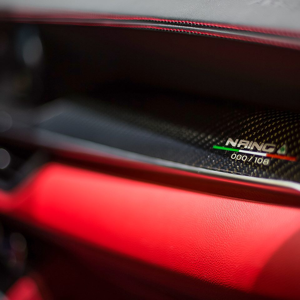 Moving into the cabin, drivers will find carbon fiber shelled Sparco racing seats with red contrast stitching. Designers also installed an individually numbered plaque and a leather / Alcantara steering wheel with carbon fiber inserts. Other highlights include a Harman Kardon premium audio system and an 8.8-inch infotainment system with GPS navigation as well as Android Auto and Apple CarPlay compatibility.