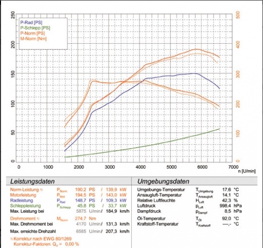 Trackparts.ch hat 183 PS und 277.5 Nm gemessen. Mit Metallkat sinds dann sogar 190 PS. Die Streuung ist also deutlich nach oben bei dem Motor.